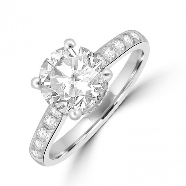 In centre focus, a brilliant cut Lab-Grown Diamond radiates beauty and comes accompanied with IGI Certification. E colour ~ VS1 clarity ~ Ideal Cut ~ Excellent Polish/Symmetry ~ Fluorescence None ~ IGI Report LG571387322 The stunning mount features a pave diamond set "hidden halo" around the claws and diamond set shoulders.