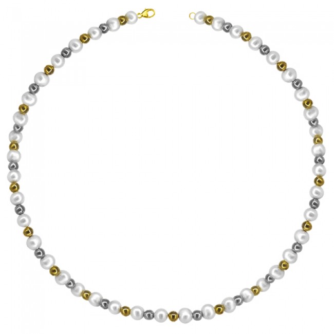 A stunning sequence of silver and gold coloured beads with white freshwater pearls (6-6.5mm). This item measures 17" in length but the design can be made to alternative lengths.