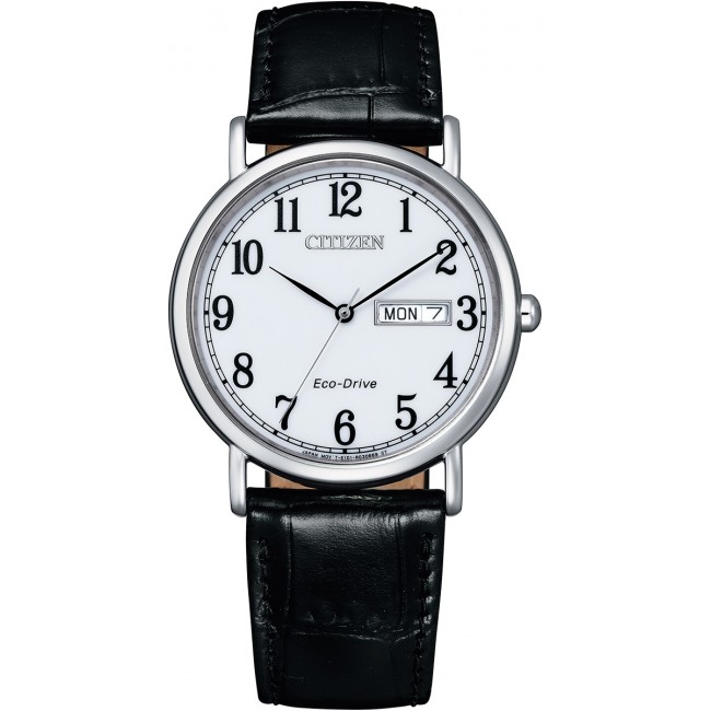 Powered by Light with a 5 Year Manufacturer's Guarantee. Stainless steel, round dial with arabic detail and day/date function. Black leather strap. BM8240-11B