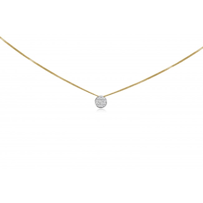 This beautifully effective illusion style pendant features a (square) princess cut, surrounded seamlessly by four marquise cuts. The diamond brilliance is encapsulated in a smooth rub-over style bezel in silky white gold. The pendant is fixed on a 16" fine curb chain, made in 18ct yellow gold.