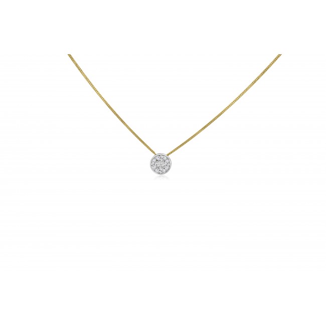 A princess cut is surrounded seamlessly by four marquise cuts to create an illusion of a larger, solitaire diamond. The centre spectacle is surrounded by a smooth, rubover style bezel setting in silky white gold. The pendant is fixed on a 16" fine curb chain, made in 18ct yellow gold.