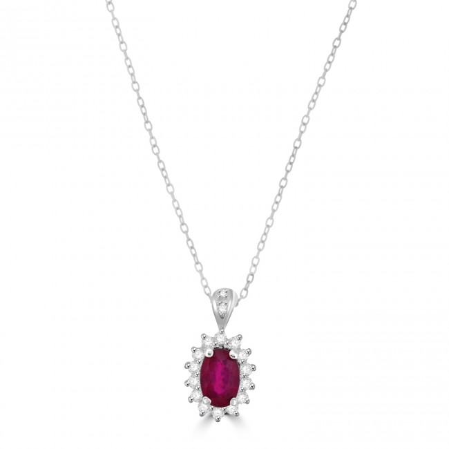 A traditional and timeless design, modernised in silky white gold. The African Ruby has been enhanced to permanently improve aesthetics. The desirable, deep red contrasts effectively with a dazzling surround of diamond brilliance. Belcher chain measures 17" with a adjuster ring to shorten.