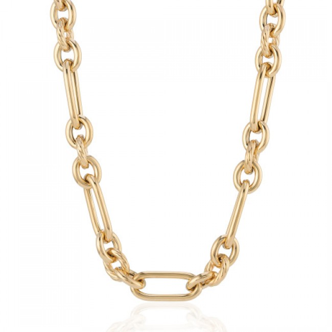 Long oval links alternate with three smaller, round links at a length of 18". Semi-hollow links, made in 9ct yellow gold.