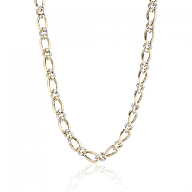 A long, yellow gold link alternates with a shorter, white gold link in this flat, open curb chain. Measuring 18" in length.