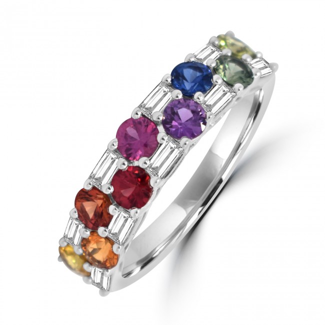 • 18ct White Gold Rainbow Sapphire and Baguette Diamond ring