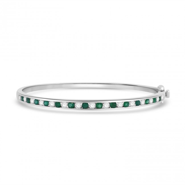 A beautifully well made bangle is hinged with an open channel of natural emeralds alternated with white cubic zirconia.