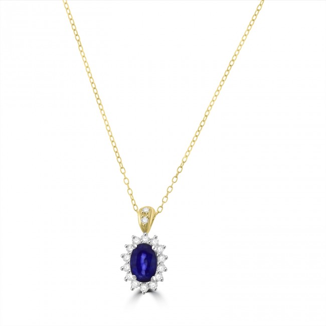 An oval cut Blue Sapphire radiates a most desirable colour. The ceylon Sapphire has been permanently enhanced by re-crystallisation diffusion. Mounted in a traditional clawed design with surround diamond. The gold bale is pave set with diamond and fitted to an 18" chain with shortening rings. Made in Italy.