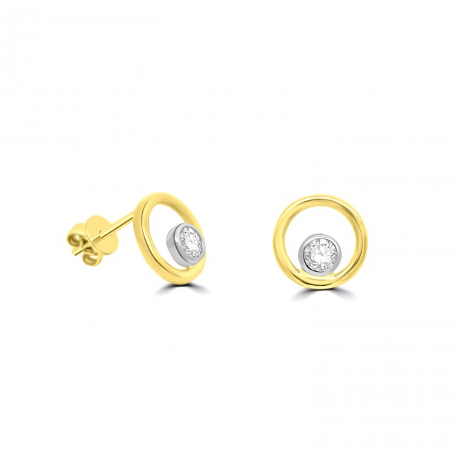A Lab-Grown Brilliant cut Diamond is set flush in a silky white gold bezel. This focal point is within a surrounding open circle, contrasting in the warm tones of yellow gold. The earrings are fitted by stem and butterfly back.
