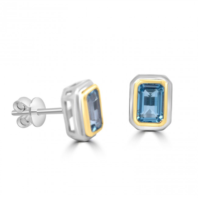 Refreshingly cool blue tones radiate from these striking, emerald cut Blue Topaz gemstones. Each is set flush in warm yellow gold with the surrounding stud earrings made in silky white gold. Fitted by stem and butterfly back.