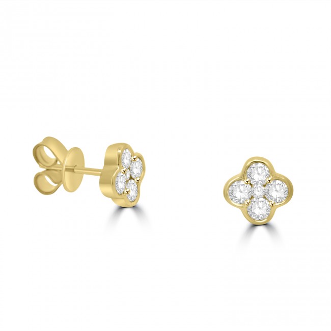 Four brilliant cut diamonds are encapsulated in the warm tones of yellow gold, to create a 4-leaf clover shape. A smaller diamond creates a seamless surface of brilliance from within centre focus. The dazzling stud earrings are fitted by stem and butterfly back.