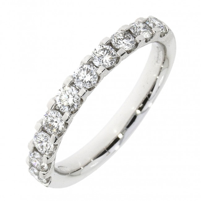 10 round, brilliant cuts are set beautifully flush within a 3mm platinum band. The setting is cut-out, castle set style to allow optimum light to radiate through and accentuate the diamond brilliance. The shared claw is smooth and square shaped, creating a soft and silky surface.