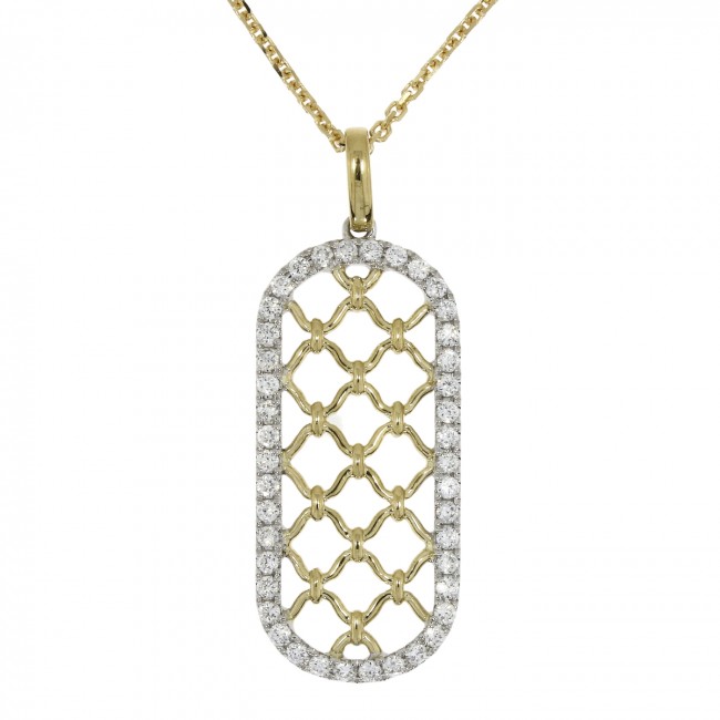 Beautifully elegant design featuring a white gold, open oblong outline, enlightened with white diamond brilliance and contrasting with yellow gold filigree detail in centre focus. The pendant measures 33mm, including a plain yellow gold bale that fits to an 18" diamond cut belcher chain (with a shortening ring at 16").