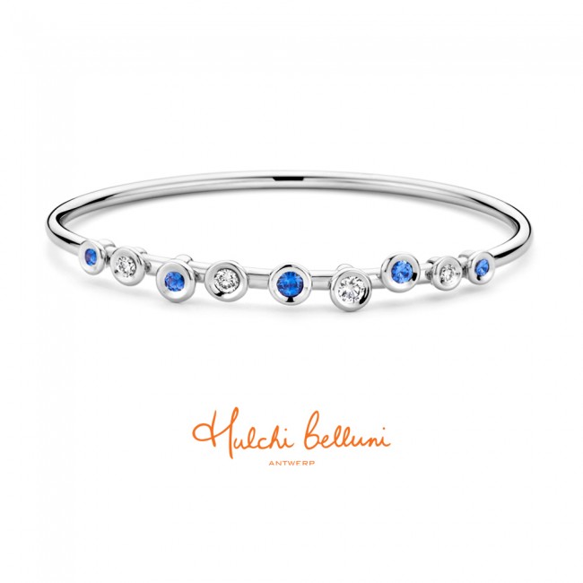 Timeless elegance, exquisite craftsmanship - discover the art of fine jewellery with Hulchi Belluni. A glorious array of white brilliance and colour tones radiate from this scatterset style bangle. Five round, Blue Sapphires and four White Diamonds, of various sizes are set flush within silky rubover settings. The solid, rounded wire profile appears seamless on the wrist with an invisible split in centre. A stunning piece from the Bouli collection by Hulchi Belluni, Belgium.