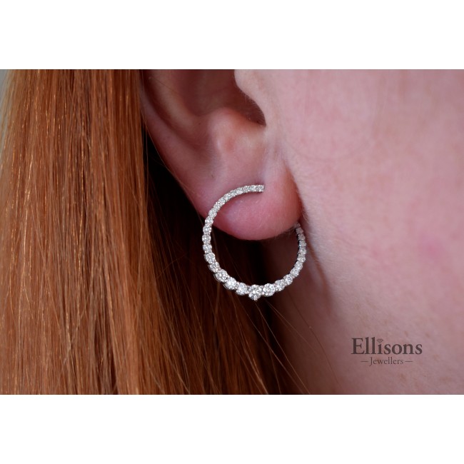 Exquisite, Italian design, expertly crafted in 18ct white gold, this unique earrings radiate effortless beauty and refined elegance. An open circle of claw set Diamond graduates to a larger centre stone, offering a focal point in a spiral that subtely descends below the ear lobe. This creates an effective illusion that the diamond circle is continuous. The earrings are fitted by stem and an impressive manufactured hinge mechanism.