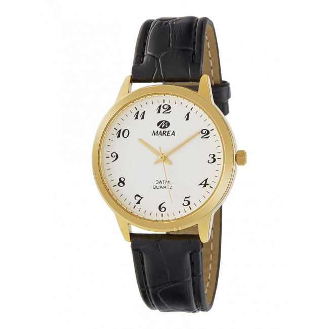 42mm Gold electro-plated Stainless steel case ~ White Dial with Arabic detail. Black Leather Strap ~ 30 metre Water Resistant ~ 2 Year Warranty