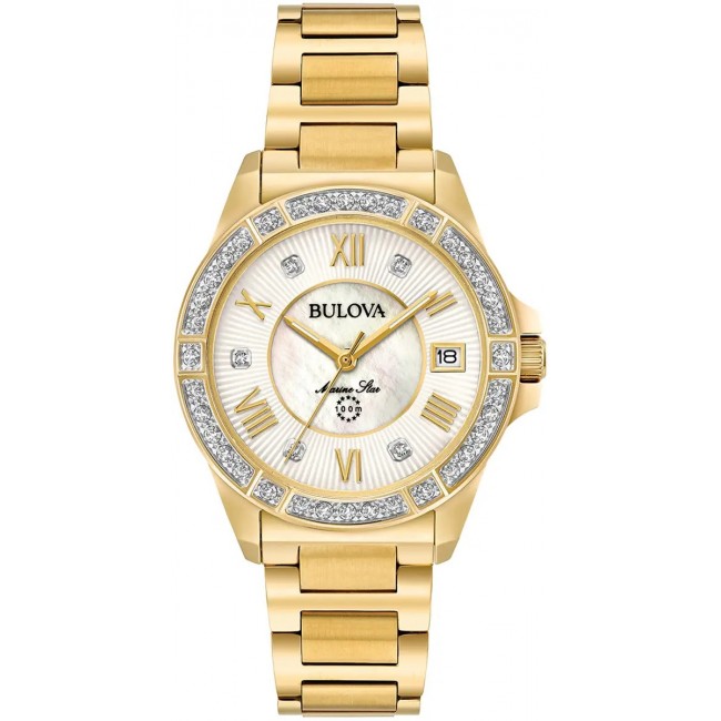 The Ladies' Marine Star from Bulova features a gold-tone stainless steel case with 29 diamonds individually hand set on gold-tone accented bezel, dial and white mother-of-pearl inner dial. Additional features include sapphire glass, screw-back case, gold-tone stainless steel bracelet with double-press deployment closure and water resistance to 100 metres. 98R235