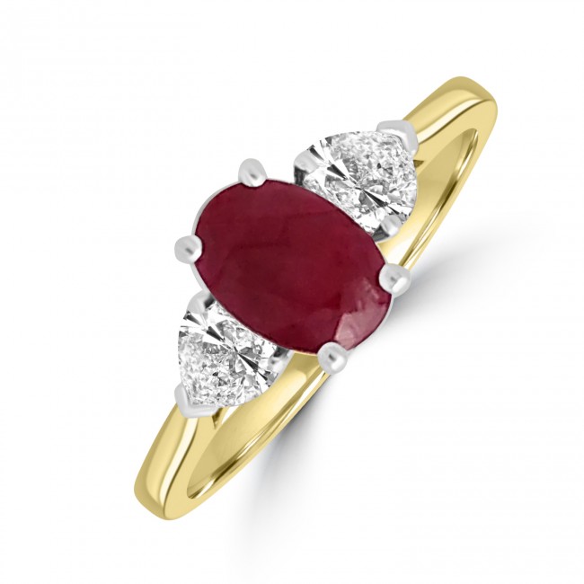An oval cut Ruby is claw set between the dazzling brilliance of two heart cut Diamonds. The deep red Ruby is complimented by the warm tones of the 18ct Yellow Gold shank.