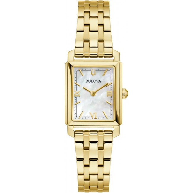 This all-new Bulova women’s timepiece brings a luxurious elegance to the already impressive Sutton Collection. The refined gold-tone stainless steel rectangular case features a mineral crystal and finishing that shines brilliantly in the light. The lustrous mother-of-pearl dial is accented with gold-tone Roman numeral markers and hands for a look of true elegance. A matching five-link gold-tone stainless steel bracelet features a deployant closure with pushers for a perfect fit and latched spring bars for easy release. This Bulova ladies’ timepiece offers an understated sense of luxury for the woman with an elevated sense of style. 97L177