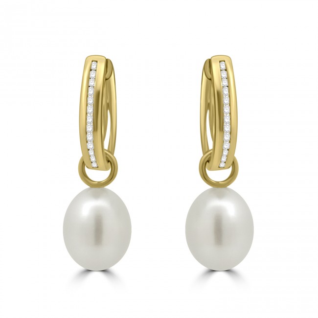 A hinged huggy style, hoop earrings is inset with channel set white diamond, crafted in the rich tones of 18ct yellow gold. A removable drop features a white freshwater pearl, oval shaped and measuring 8-8.5mm.