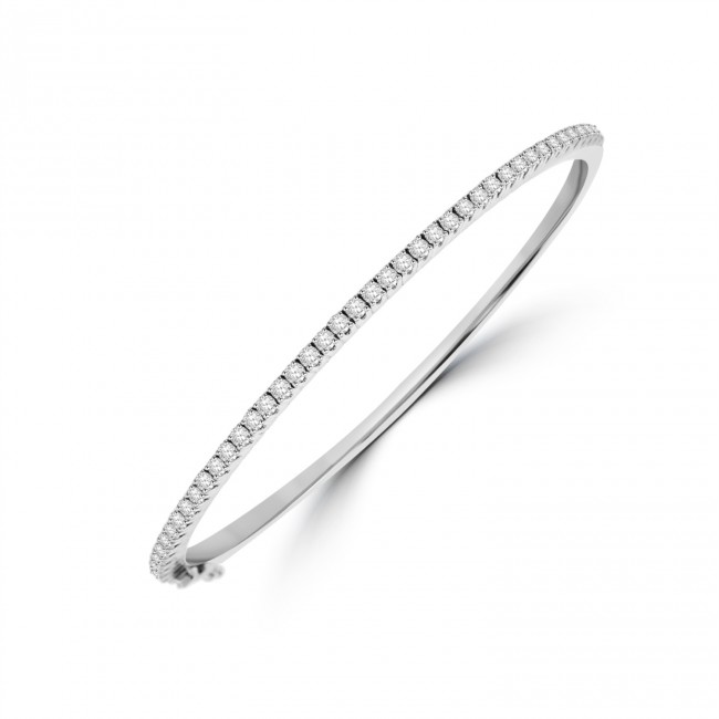 Forty-five brilliant cut diamonds are inset in a cut-out castle setting, crafted in silky white gold. The solid bangle is hinged to open, with an integrated box clasp and double safety latch. The bangle has a inside diameter of 56 x46mm approx.