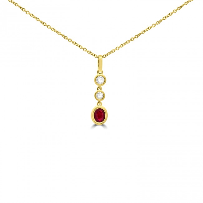 The deep red tones of an oval cut Ruby are complemented within the warm tones of a smooth, rubover setting as the focus of this endearing drop pendant. Two white diamonds feature above. The pendant is fitted to an 18" belcher chain, crafted in 9ct yellow gold.