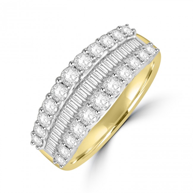 This dazzling two-tone eternity style ring features a tapering platinum setting, saturated in the brilliance of graduated baguette cuts bordered by outer rows of brilliant cut diamond. The warm, majestic tones of an 18ct yellow gold shank contrast effectively.