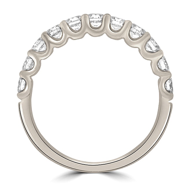 A series of ten brilliant cut Diamonds set in a stunning, low profile setting. Shared claws create a beautifully rounded profile, following the contours of the ring band. The side profile is open with 'loopy', U-shaped settings, resembling a cog wheel. Crafted in luxurious Platinum.