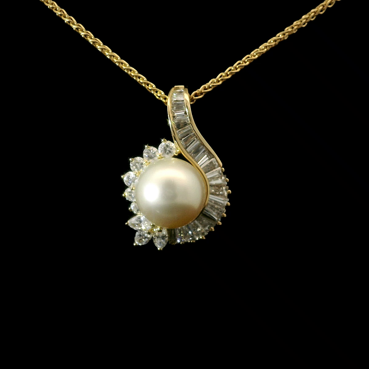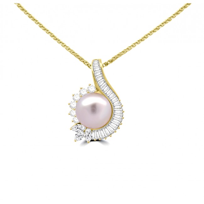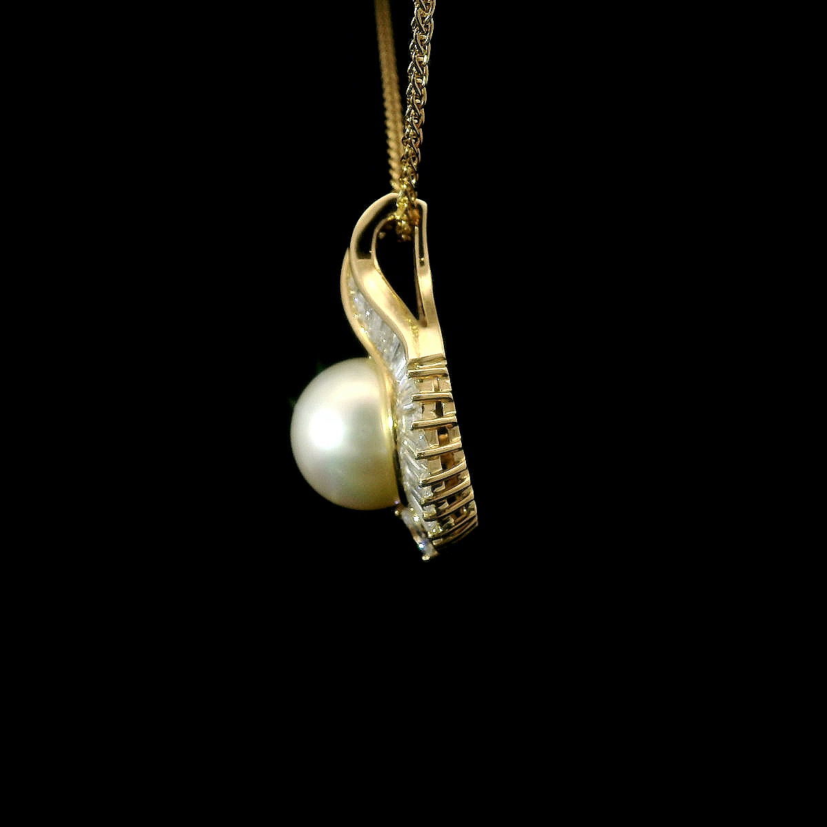 Exquisite and unique in design, expertly crafted in the rich, majestic tones of 18ct yellow gold. In centre focus, a South Sea Cultured pearl is radiate with white lustre and beautifully uniform 12.4mm. Encased in a curved span of diamond baguettes, three marquise cuts and six brilliant cuts, offering an impressive 2.75ct fine diamond. Please Note: Chain is shown for illustrative purposes only ~ sold separately