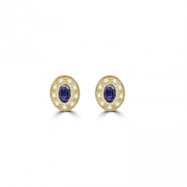 Royal Blue Sapphires radiate from within a smooth, bezel setting in centre focus. These coloured gemstones are of natural, Ceylon origin, permanently enhanced to desirable aesthetics. A row of grain set white diamond brilliance surrounds. The stud earrings have been crafted in 9ct yellow gold and are fitted by stem and butterfly backs.