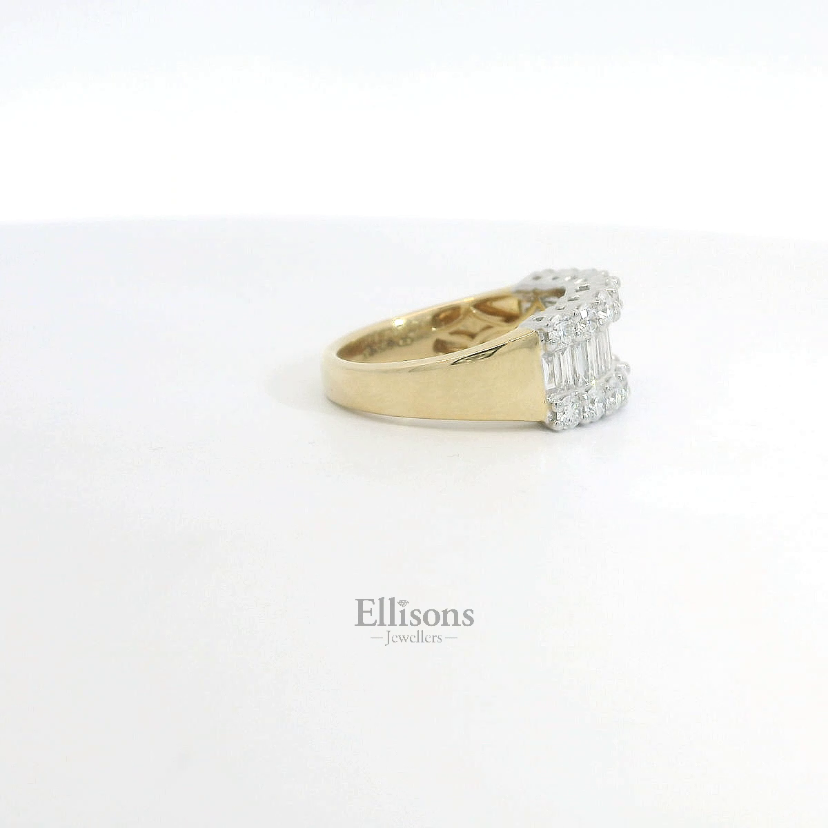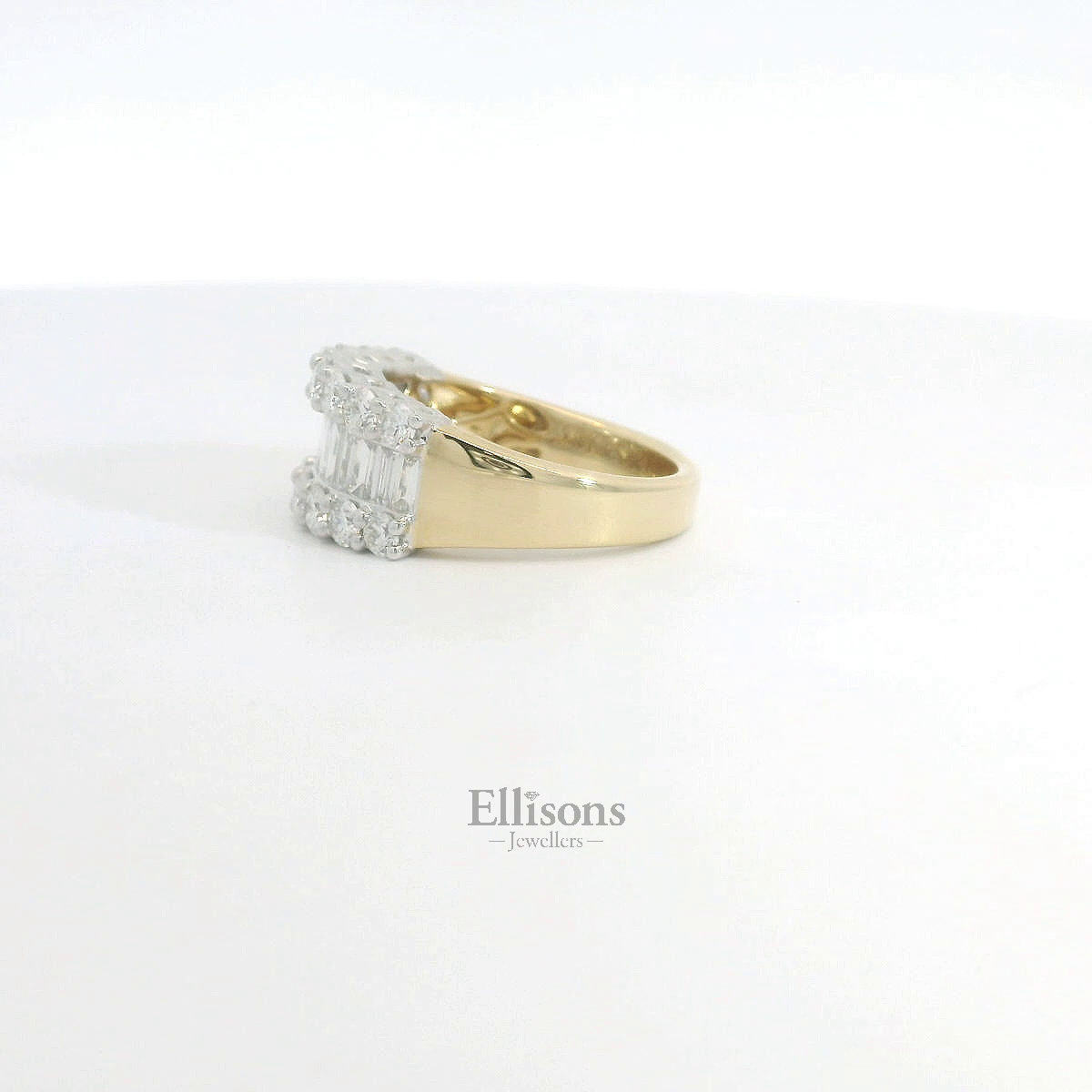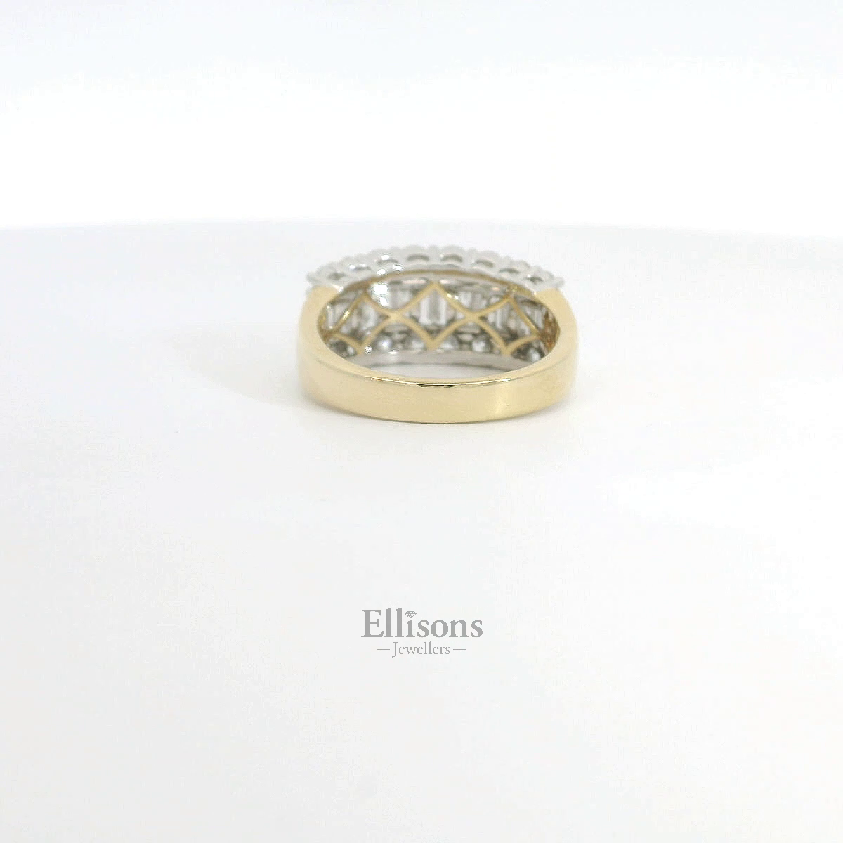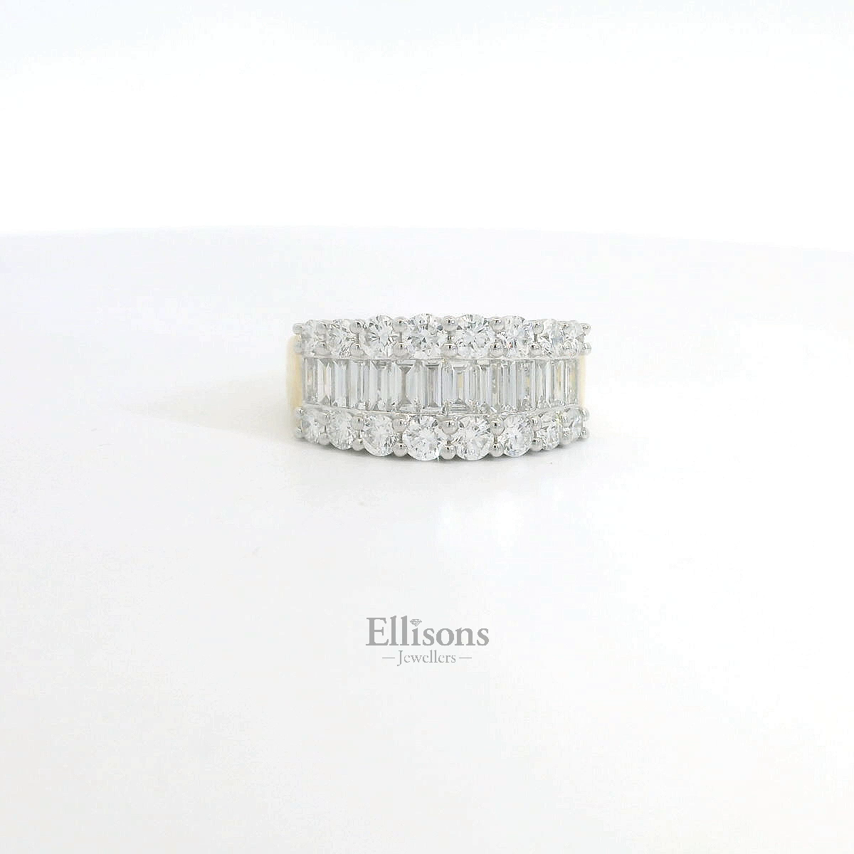 A modern classic, crafted beautifully in a two-tone platinum and 18ct yellow gold ring. A series of eight brilliant cut diamonds graduate in size and align both outer rows with dazzling brilliance. An inner channelled row of strikingly clear baguettes add definition and style.