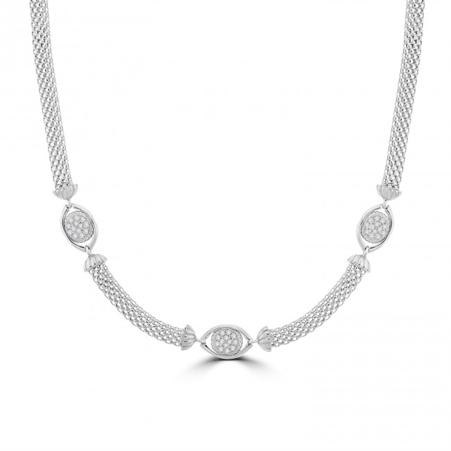This 17" mesh style collar is made in sterling silver with a white rhodium finish. The necklet features 3 cubic zirconia set sections and attractive design.