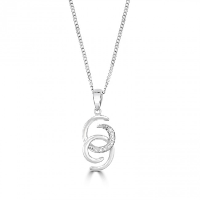 This beautiful pendant features two overlapping curls with a segment inlaid with white, sparkling cubic zirconia. The fine curb chain measures 18" with a ring for shortening at a 16" length. High polish, rhodium finish.