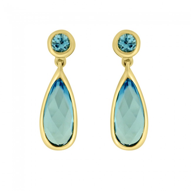 The cool blue tones of Blue Topaz is contrasted beautifully with majestic gold settings. A rubover, round stud is fitted with a stem and butterfly back. From this a pear shaped and multi-faceted stone creates a stunning drop.