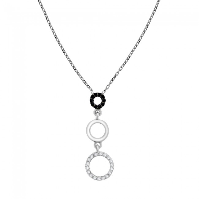 This eye-catching 3-tier drop pendant features graduating open circles; the first contains a halo of clawed Black Cubic Zircona stones,the second is plain and the third contains white stones. The spectacle is fixed on a 17" chain, all radiant in silky 9ct white gold.