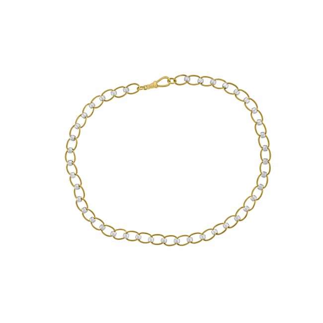 Handmade in solid, 9ct gold, this rollerball style chain features rose open curb links, joined by white beads.