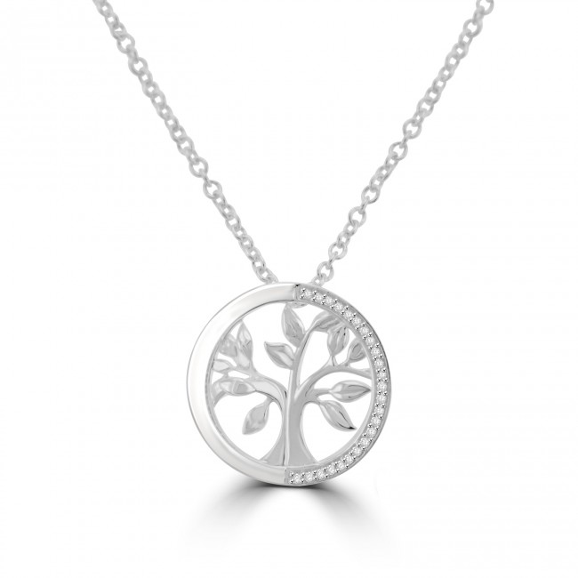 Two open circles interlock with a beautiful Tree of Life design in centre focus. The scintillation of white cubic zirconia radiates from one side of the circle. The belcher chain measures 18" with a shortening ring at 17". Made in Sterling silver with a white Rodium finish.