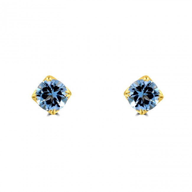 Two round cut, 6mm Blue Topaz gemstones are claw set within the rich, warms tones of a 9ct yellow gold clawed setting. The studs are fitted by stem and butterfly backs.