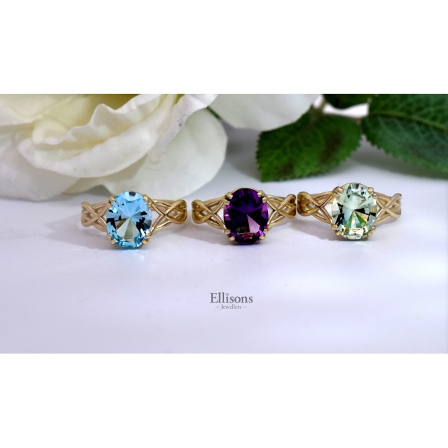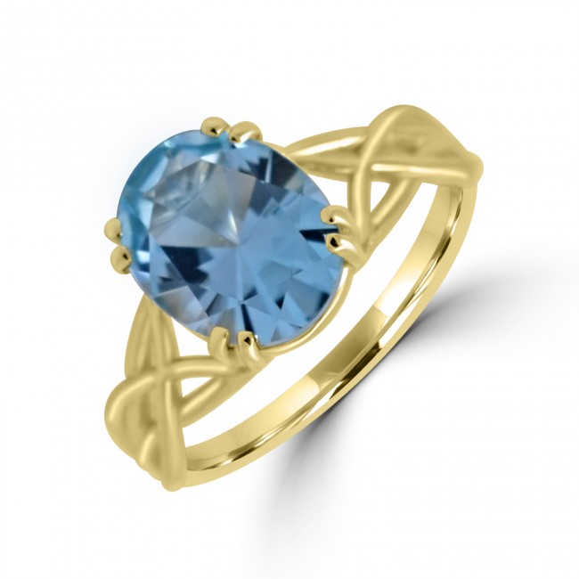 A beautifully proportioned and exquisitely cut, Oval Blue Topaz is claw set in the warm tones of yellow gold. The 4-claw, double tipped setting is featured within an abstract "twist" shoulder design.