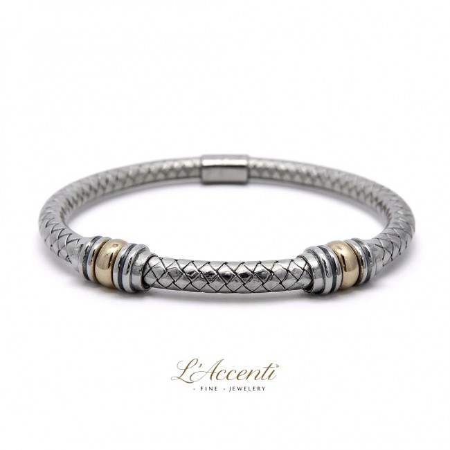 Beautifully design and expertly crafted in sterling silver and 18ct yellow gold (1.1g). A seamless strand of rounded, anaconda-style textured surface is enlighted with two series of yellow and silver ringlets. The bangle is subtely hinged for opening. Made in Italy. Two sizes available (inside measurements):- Small - 60 x 50mm Large - 65 x 50mm
