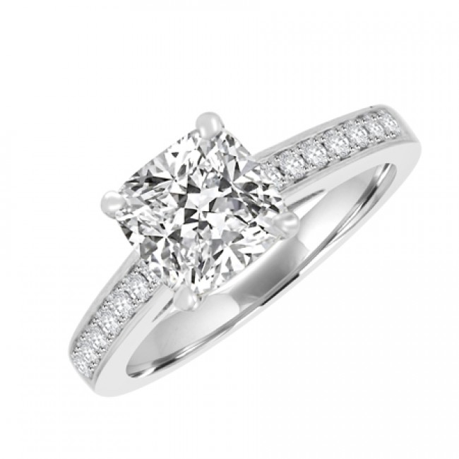 Platinum Solitaire Cushion Diamond Ring with Stone Shoulders Key Features