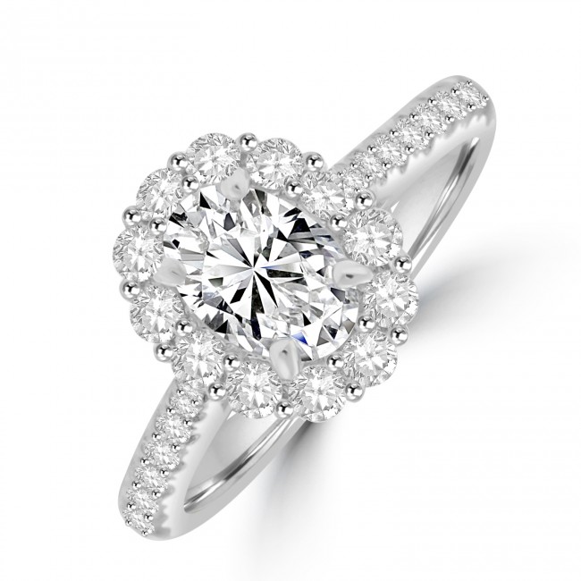 A stunning spectacle of fine diamond brilliance with a handpicked Oval cut in centre focus. The shared claw setting features twelve round, brilliant cuts in surround and their size and profiles create an attractive scalloped edge to the overal cluster. The modern, wedding ring friendly setting is castle set with diamond in the Platinum shoulders. Oval .70ct Diamond~ GIA Report 7503466929 ~ D colour ~ Si2 clarity ~ Excellent Polish ~ Very Good Symmetry ~ Fluorescence None