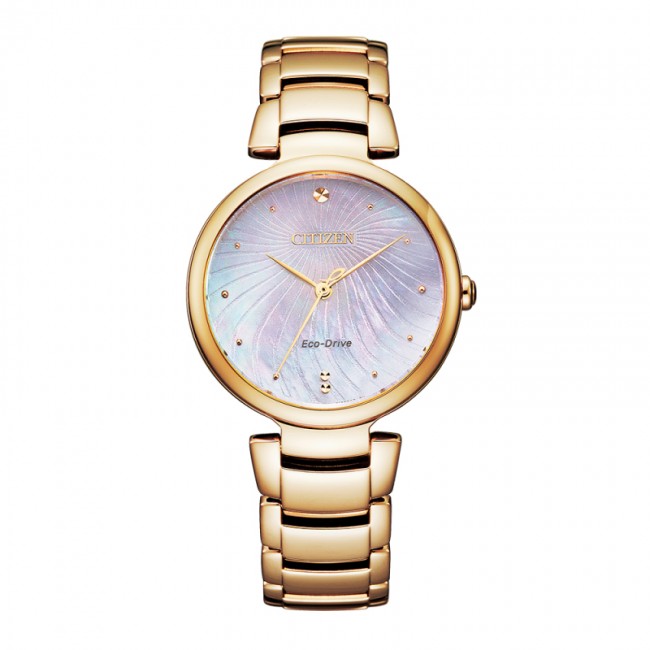 This rose gold electroplated watch displays a beautifully designed dial with patterned mother of pearl. EM08530-81Y
