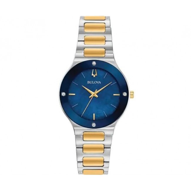 32mm case with glass ~ Midnight blue, textured dial 4 diamonds inset in bezel Two-tone Stainless steel and Rose Bracelet 98R273